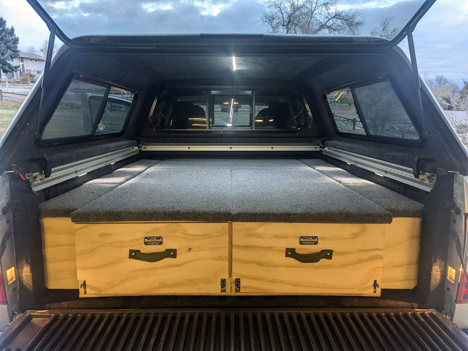 One of our most popular designs as it includes full coverages for sleeping as well as two tailgate facing drawers, plus a large cab end bin for larger items. Starts at: $1,500.00