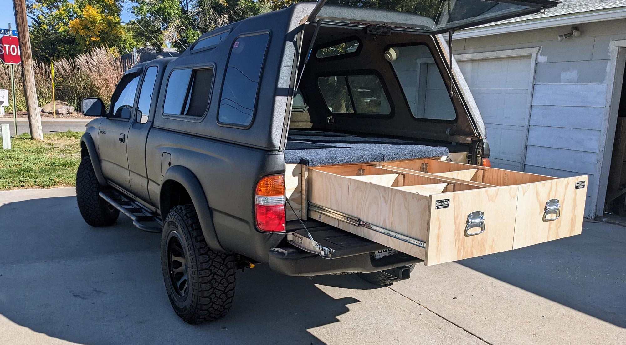 The Bonnie is a full coverage solution with one tailgate facing drawer with open storage on the other side of the truck bed. It also features a smaller bin on the open storage side that can easily be removed for full length storage below and sleeping above. Starts at: $1,500.00